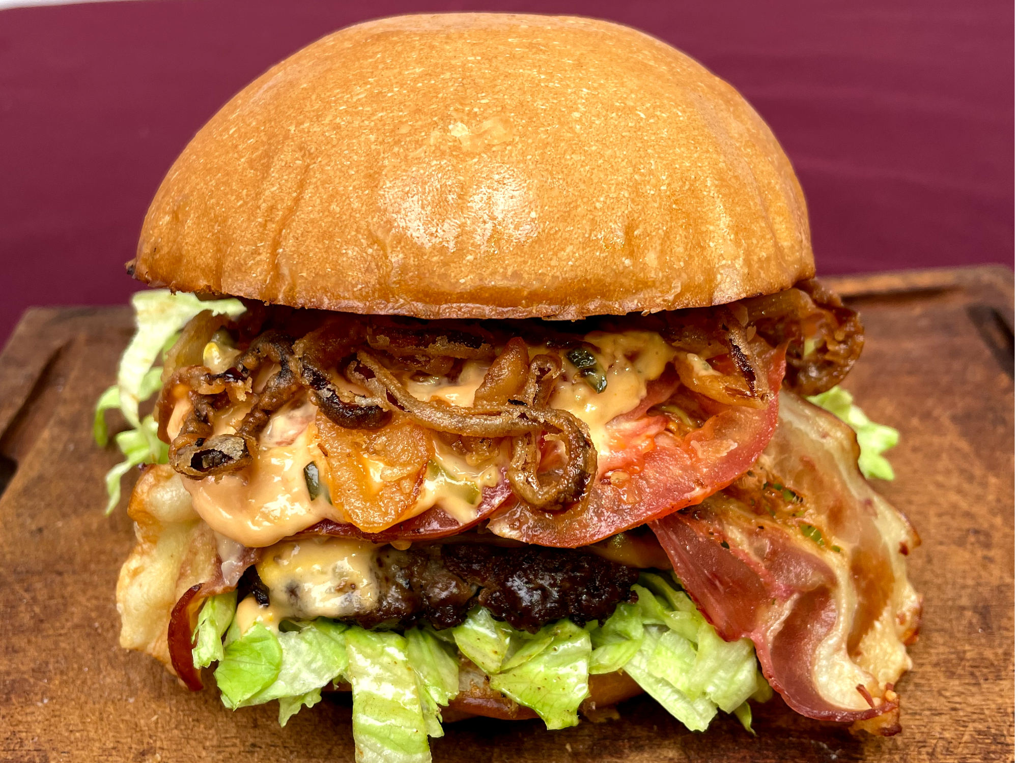 Pan de papa, carne, queso cheddar, cebolla crispy (dulce), tomate, lechuga, bacon y salsa thousand island. Con Papas Fritas.